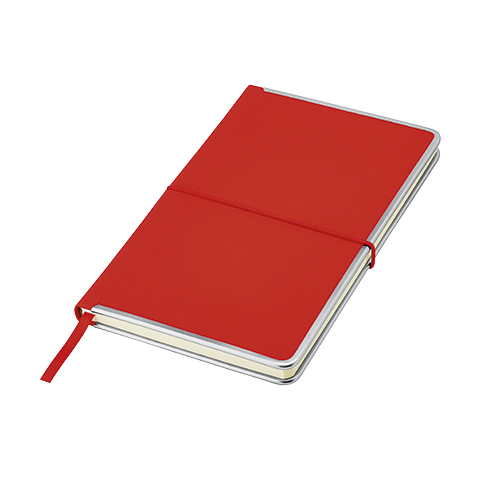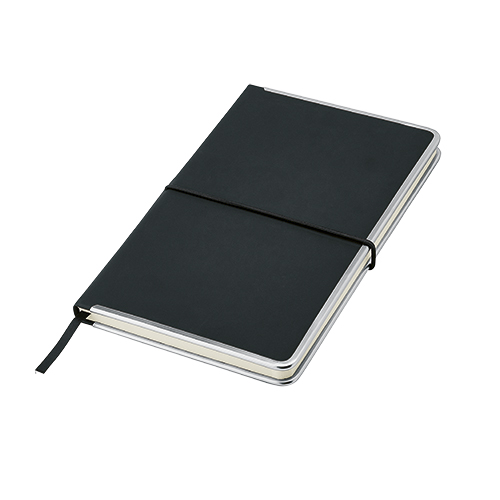 Bloco de notas A5, capa com rebordo em metal e bolsa.
